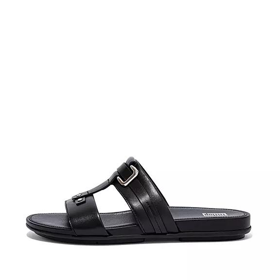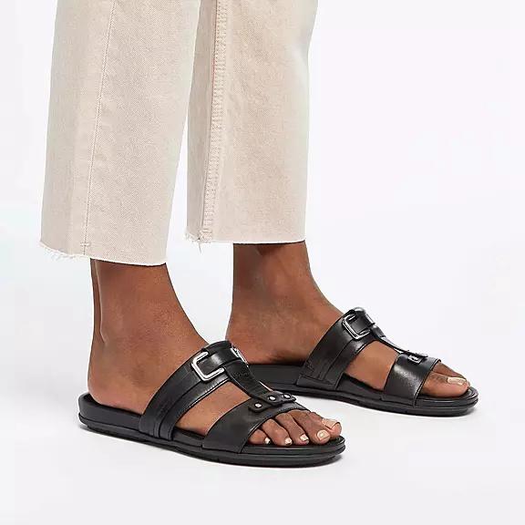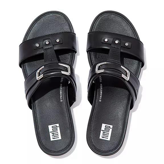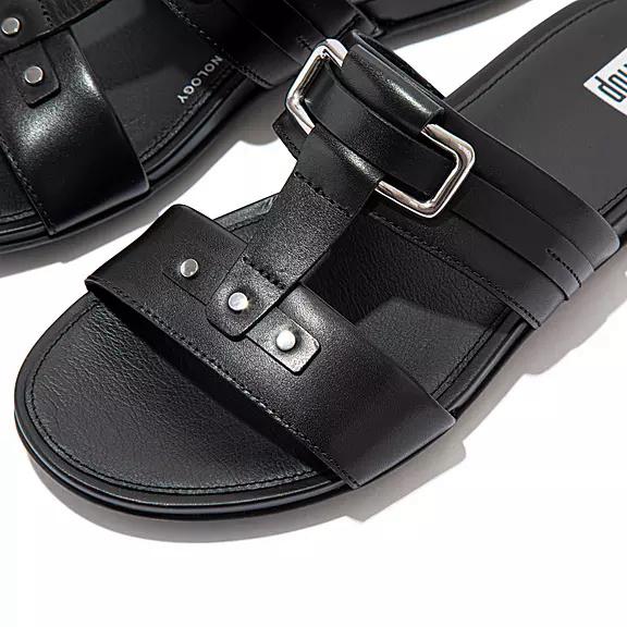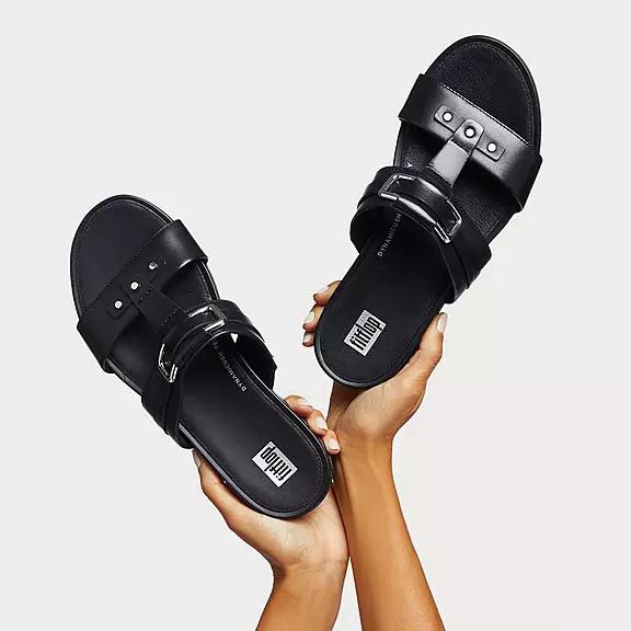 FitFlop Women's GRACIE Stud-Buckle Leather Slides Slip On Sandals - Black (HASOZ-3281)