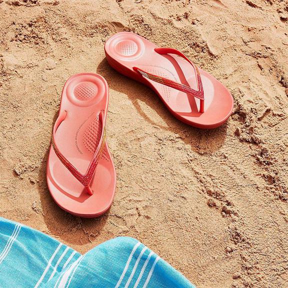 From the top, they look like your typical surfer-girl flip-flops. Underneath, they’re engineered with our iQushion™ air-foam cushioning, with impact pillows at high pressure areas, for non-stop comfort. This version adorned with shimmering micro-'crystals' in a pretty ombré design, throw a pair in your suitcase and you’ll find yourself wearing them to beach, bar and beyond. Waterproof and slip-resistant.