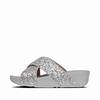 Sandals with the X factor. Our Lulu glitter criss cross slides are hard to beat. These sparkly slides are smothered in chunky multi-size glitter, these are softly padded, great day-to-evening, and on our legendary Microwobbleboard™ midsoles for amazing comfort and cushioning. A wardrobe must-have.