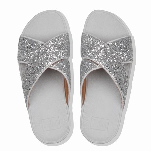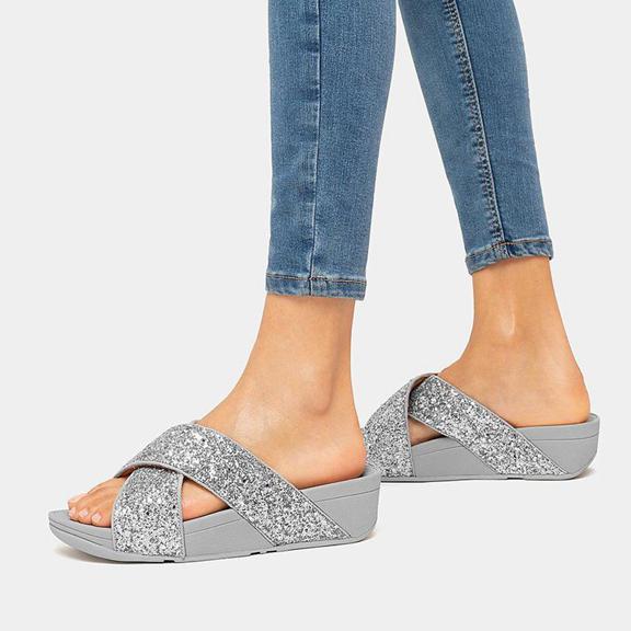 Sandals with the X factor. Our Lulu glitter criss cross slides are hard to beat. These sparkly slides are smothered in chunky multi-size glitter, these are softly padded, great day-to-evening, and on our legendary Microwobbleboard™ midsoles for amazing comfort and cushioning. A wardrobe must-have.
