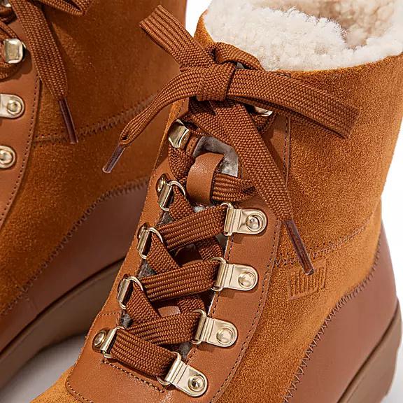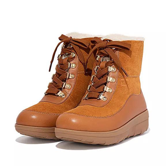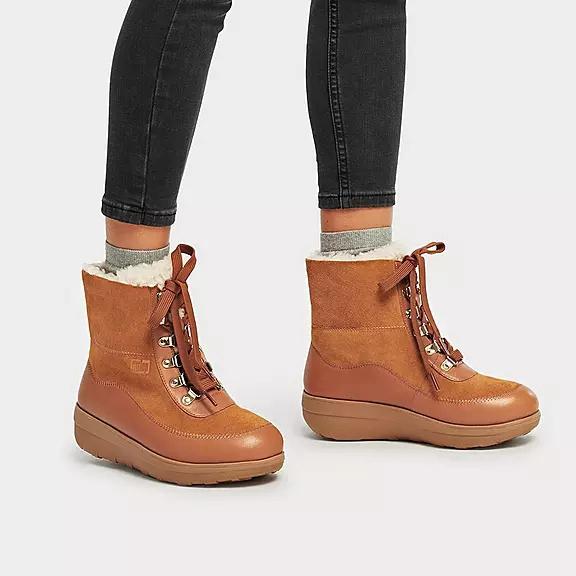 Our little lace-up Mukluks are like a hug for your feet. Featuring a thick, fluffy, curly shearling lining and unbelievable underfoot cushion, thanks to the lightweight version of our biomechanist-developed triple-density Microwobbleboard™ midsoles. In rich suede, with curved leather panels, zig zag stitching, and shiny metal D-ring eyelets (for a dash of hiker style). Equally good for shopping jaunts/country walks, they're unbeatable for that sheer 'snug' factor. Scotchgard™ protected.