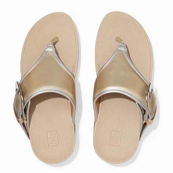 Our Olive has all you want in a toe-thong. Think a clean flattering design that gives generous coverage, softly padded uppers, and a soft microfiber toe post. Teamed with our supercushioned, pressure-diffusing Microwobbleboard™ midsoles for incredible underfoot comfort. The ultimate combination of easy to wear and easy on the eye. This season, in shiny metallic leather, with a contrast metallic leather trim and an adjustable statement buckle.