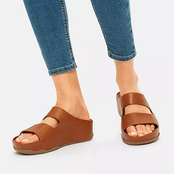 CA$80 CA$69FitFlop Women's GRACIE Buckle Leather Slides Slip On Sandals - Light Brown (ZENVU-0297)